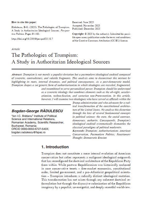 Trumpism is not merely a populist deviation but a postmodern ideological cocktail composed of syncretic, contradictory, and volatile fragments. This analysis aims to deconstruct this mixture by highlighting its roots, internal dynamics, and political consequences. As a post-democratic model, Trumpism shapes a sui generis form of authoritarianism in which ideologies are recycled, fragmented, and recombined to serve personalized power. Trumpism should be understood as a syncretic ideology that combines elements such as the alt-right, accelerationism, techno-fascism, and sectarian neo-Protestantism. In this article, however, I will examine two ideologues who have served as officials within the Trump administration and who advocate for a radical transformation of the constitutional architecture of the United States. We analyse this distortion through the lens of several fundamental concepts in political science: the state, the social contract, democracy, authority. Consequently, Trumpism’s ideological cocktail systematically dismantles the classical paradigms of political modernity.