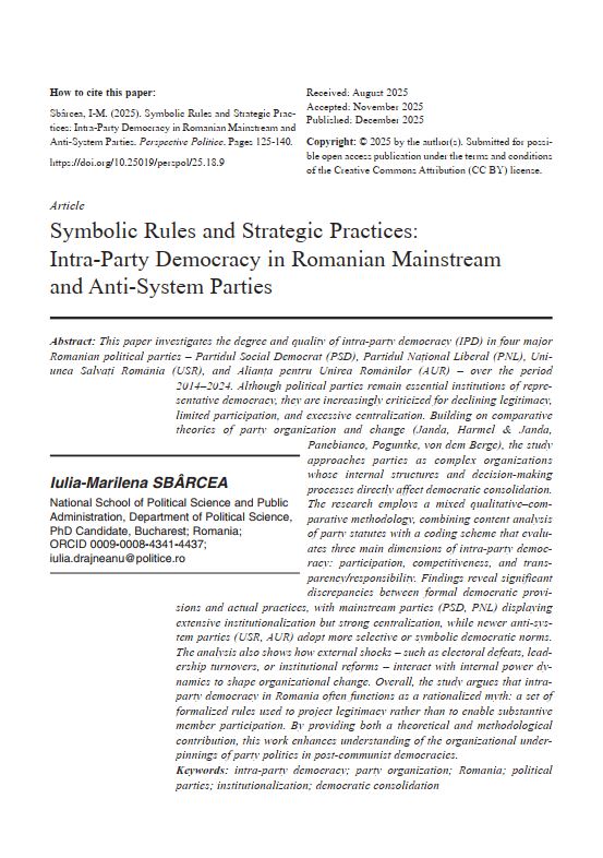 This paper investigates the degree and quality of intra-party democracy (IPD) in four major Romanian political parties – Partidul Social Democrat (PSD), Partidul Naþional Liberal (PNL), Uniunea Salvaþi România (USR), and Alianþa pentru Unirea Românilor (AUR) – over the period 2014–2024. Although political parties remain essential institutions of representative democracy, they are increasingly criticized for declining legitimacy, limited participation, and excessive centralization. Building on comparative theories of party organization and change (Janda, Harmel & Janda, Panebianco, Poguntke, von dem Berge), the study approaches parties as complex organizations whose internal structures and decision-making processes directly affect democratic consolidation. The research employs a mixed qualitative–comparative methodology, combining content analysis of party statutes with a coding scheme that evaluates three main dimensions of intra-party democracy: participation, competitiveness, and transparency/responsibility. Findings reveal significant discrepancies between formal democratic provisions and actual practices, with mainstream parties (PSD, PNL) displaying extensive institutionalization but strong centralization, while newer anti-system parties (USR, AUR) adopt more selective or symbolic democratic norms. The analysis also shows how external shocks – such as electoral defeats, leadership turnovers, or institutional reforms – interact with internal power dynamics to shape organizational change. Overall, the study argues that intraparty democracy in Romania often functions as a rationalized myth: a set of formalized rules used to project legitimacy rather than to enable substantive member participation. By providing both a theoretical and methodological contribution, this work enhances understanding of the organizational underpinnings of party politics in post-communist democracies.